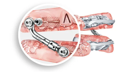Shorter adjustment arms increase the device's compactability and wearing comfort. If extra advancement is needed, the shaft can be moved to the backside with an extra anterior fixing unit.